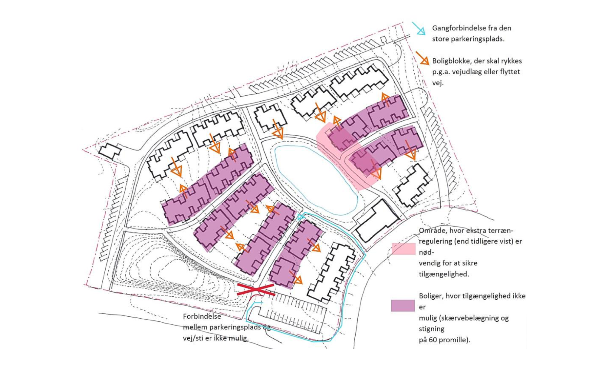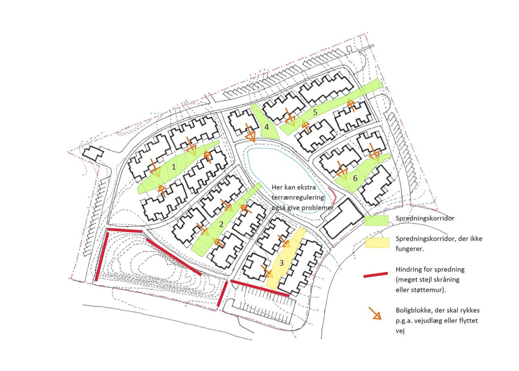 Øst for søen kommer boligerne til at ligge meget tæt på frednings-zonen, hvor der vil blive behov for en del terrænregulering for at sikre overholdelse af tilgængelighedskravene (dette er ikke nævnt i afsnit om terrænregulering). Samtidig vil krav om øget vejudlæg for brandvej (skærvebelagt sti) mellem to af rækkerne føre til, at disse boliger skal rykkes længere ud i spredningskorridorerne.