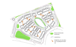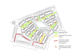 På lokalplanens bebyggelsesplan er der indtegnet 62 boliger fordelt på 19 blokke. Nogle af disse blokke ligger i forlængelse af hinanden med en smule forskydning, så de opfattes som samlede rækker.