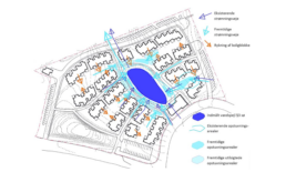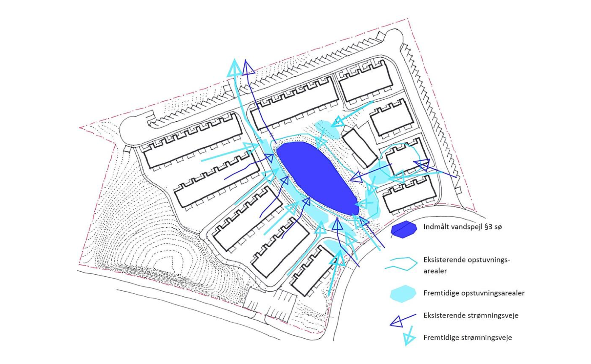 Indtegning af eksisterende strømningsveje ved skybrud viser, at fælleshuset vil blokere for disse. Samtidig er boligblokkene øst for søen sammen med brandvejen placeret så tæt på, at der ikke er den nødvendige plads til opstuvning af skybrudsvand omkring søen.