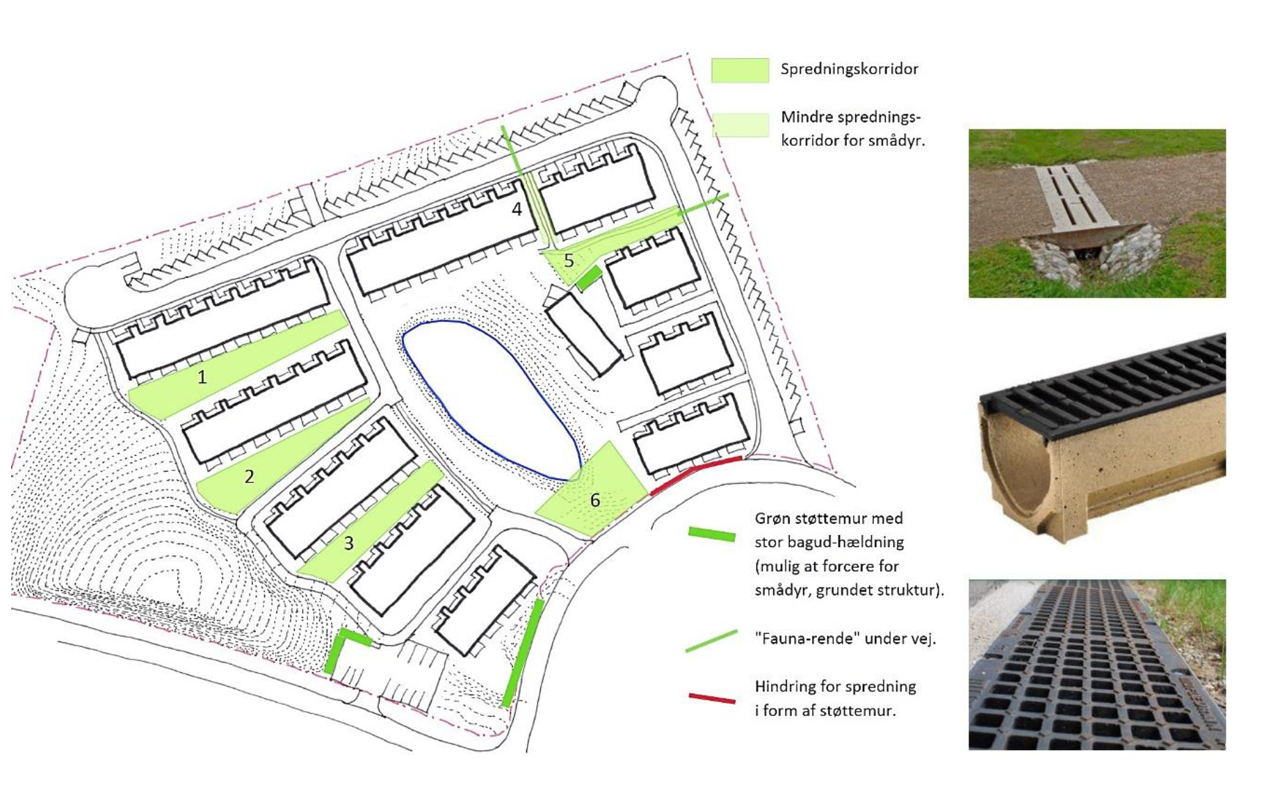 Nr. 1: Både regnbed og kile mellem blokkene vil fungere som spredningskorridor. Opstemningerne i regnbedet udformes, så de nemt kan forceres af dyr. En del af opstemningene vil samtidig være oplagte opholdssteder for krybdyr og insekter. Både regnbede og græsarealer tilsås med engblanding og slås kun 1-2 gange om året.