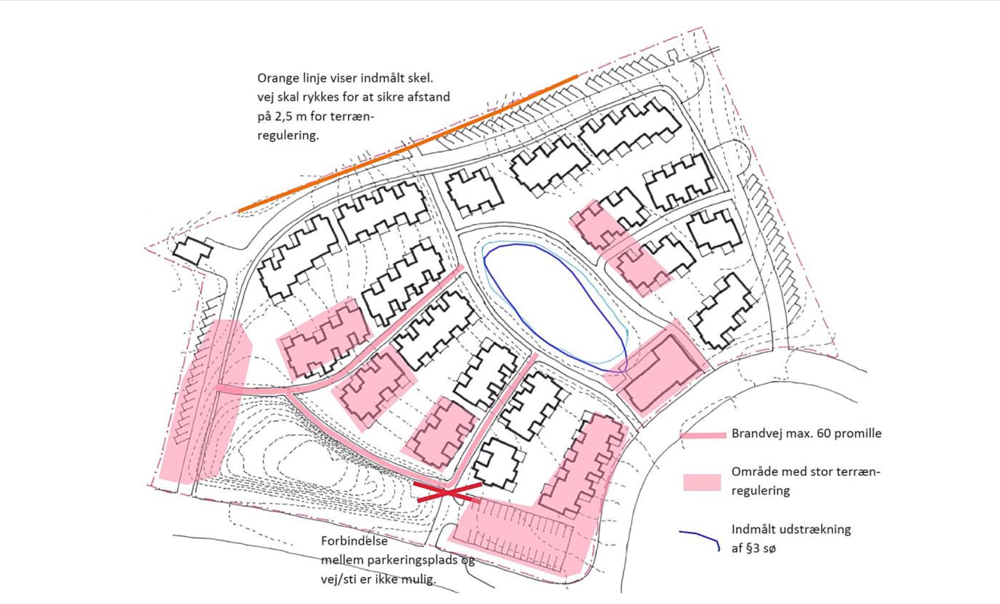 Anlæg af brandvej vekslende med natursti på begge sider af §3 søen betyder terrænregulering ind i fredningszonen på begge sider. Med de skarpe sving ind og ud mellem boligblokkene giver det meget vejanlæg for at overholde vejreglerne vedr. svingradier.