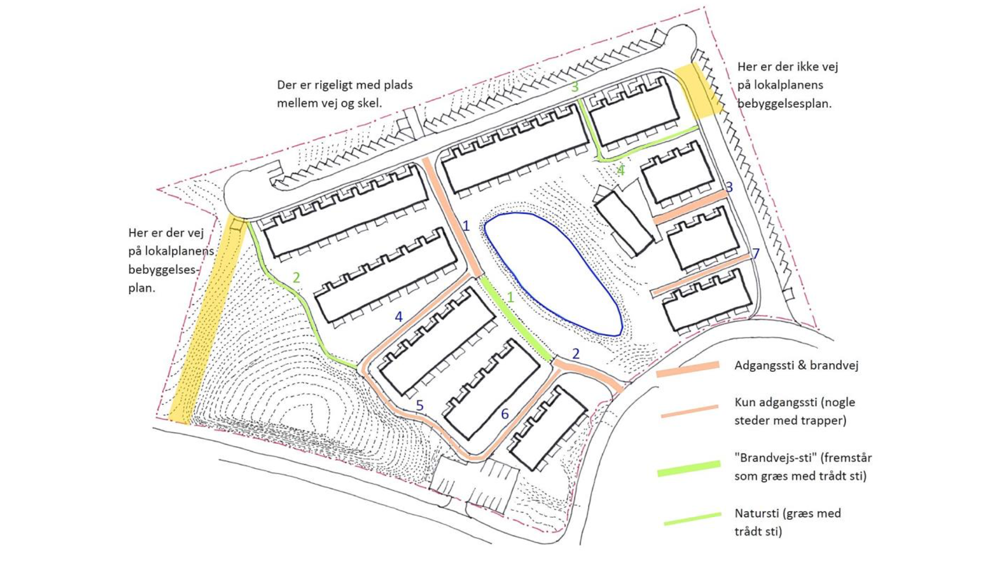 På situationsplanen er der planlagt 51 boliger fordelt på 10 blokke, hvor 3 af blokkene ligger i forlængelse af hinanden med plads til brandvej og natursti i mellemrummene. Sydvest for §3 søen er der her kun placeret 5 rækker/blokke. Der er tilstrækkeligt med plads mellem rækkerne til, at terræn kan reguleres, og adgangsforhold kan sikres. Få af boligerne kan man kun få adgang til via terræntrapper (14-15 stk.), hvor der dog etableres dobbelte slisker, så man kan komme til boligen med hjælp.